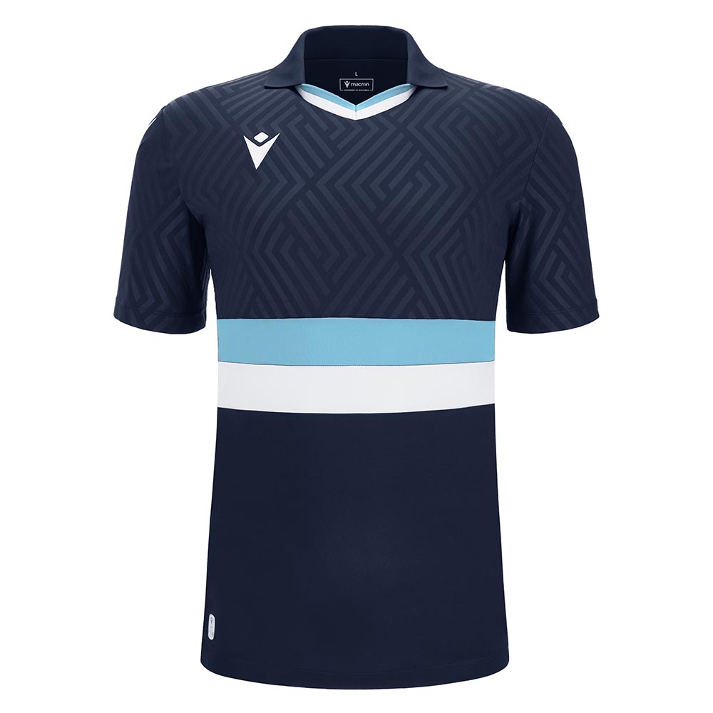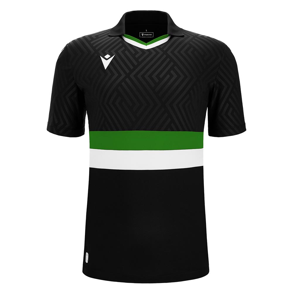 This shirt is made entirely in Eco-Fabric, obtained from 100% recycled PET and features a knitted polo shirt collar complete with a knitted two-tone V-neck.
